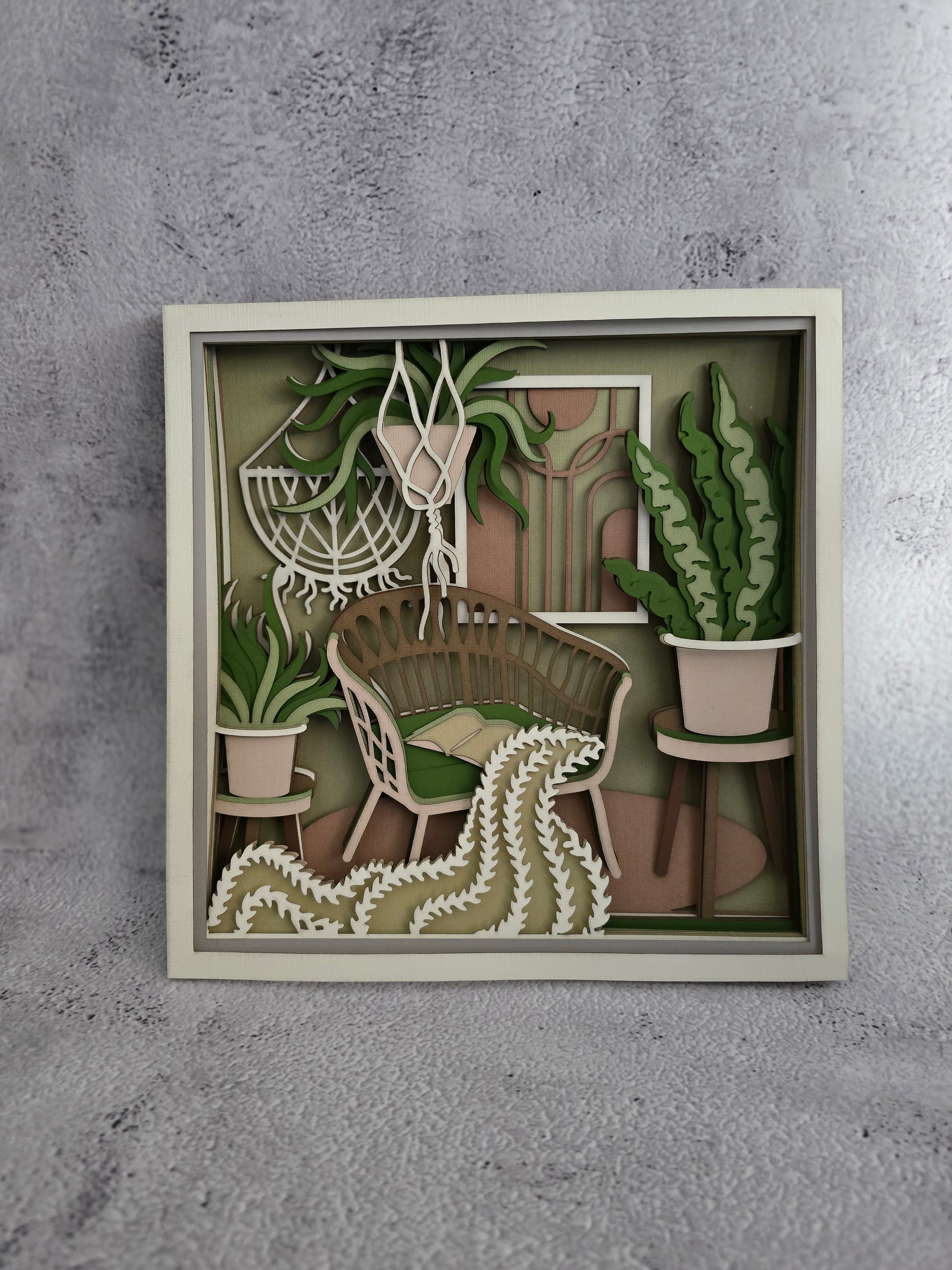 Elevate your interiors with our exclusive boho chair adorned with lush green plants from McDowell Creations. This chic, hand-crafted piece exemplifies our commitment to unique and artistic home décor, perfect for the modern, eco-conscious home. Complement your space with our shadow box made with 13 layers, size 8x8, showcasing intricate and exquisite detailing. Shop now to experience the fusion of nature and artistry, crafted meticulously by our expert artisans. Align your décor with McDowell Creations’ unparalleled dedication to quality and creativity.
