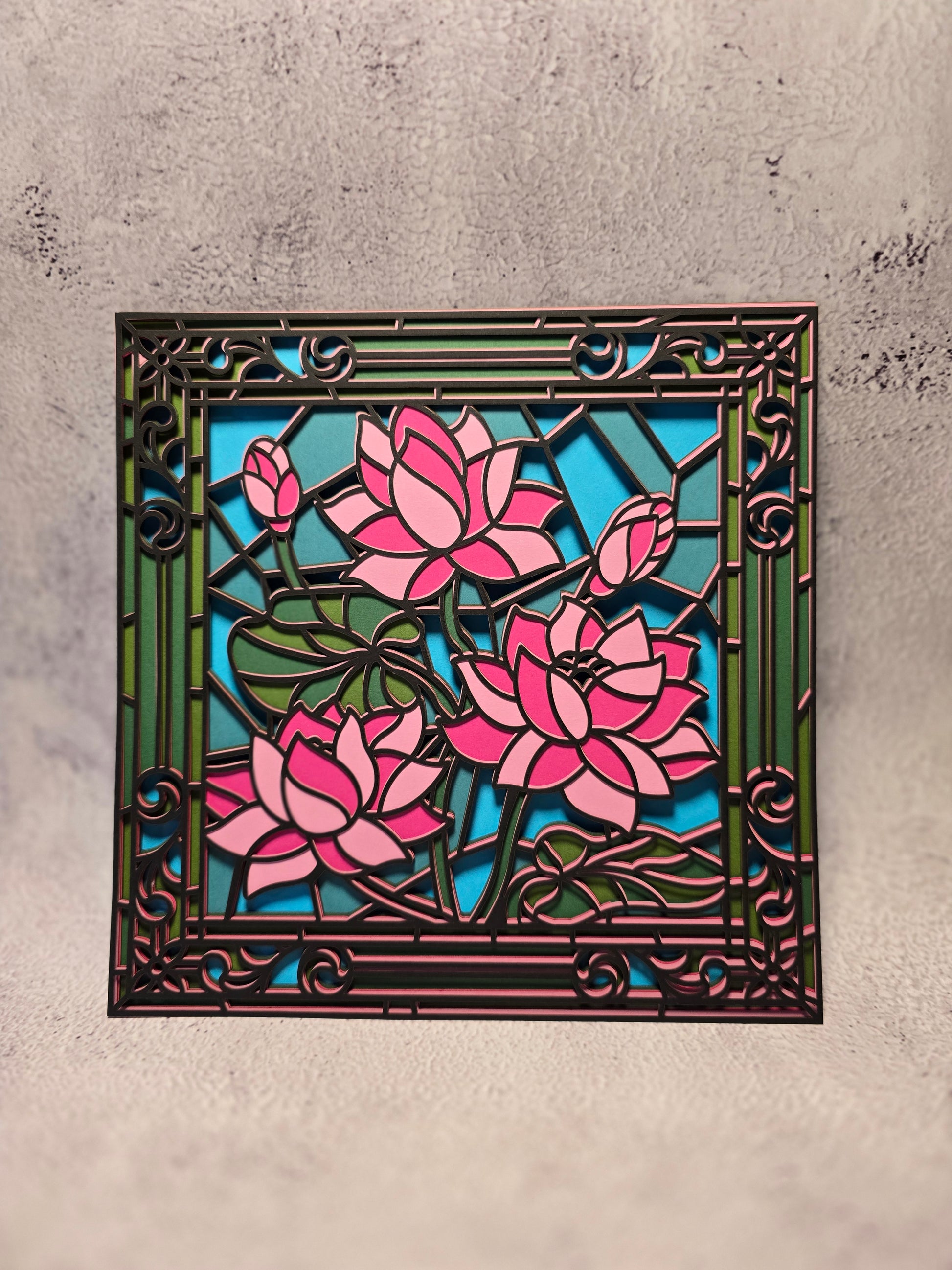 This handcrafted shadow box features a delicate arrangement of pink lotus flowers artfully layered across seven dimensions. Each layer is meticulously designed to create depth and enhance the natural beauty of the lotus, offering a sophisticated and serene decorative piece. Made to order with precision, it delivers an elegant focal point that elevates any space with subtle artistry and refined craftsmanship.